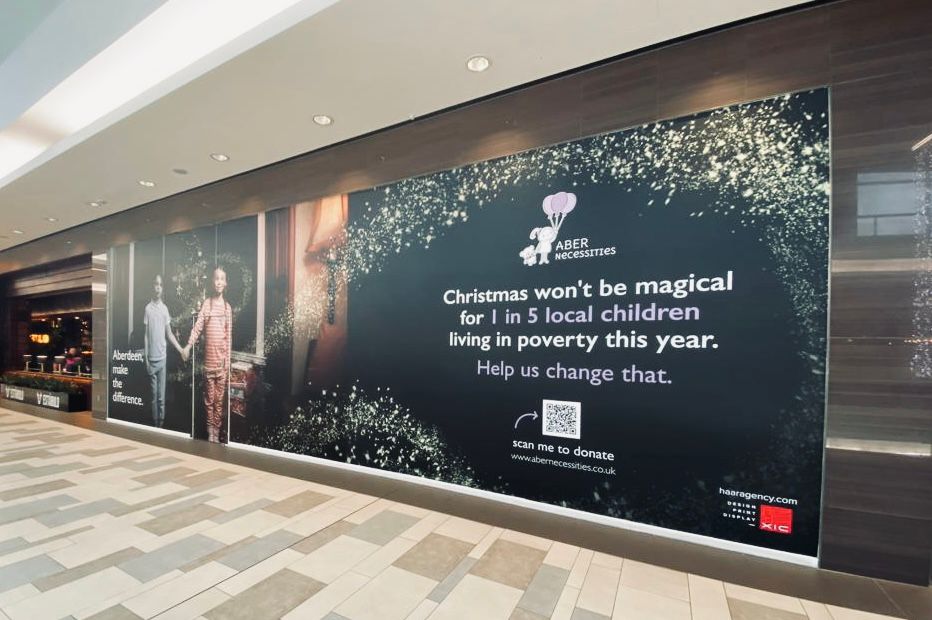 We’re delighted to have supported multiple charities this Christmas, including AberNecessities’ No Child Should Go Without campaign which aims to provide disadvantaged children across North-east Scotland with the necessities and opportunities they need to grow, learn, develop and thrive. Our team applied a new QR code to the hoarding we printed and installed in Union Square last year, while also supporting with brand new signage for AberNecessities HQ.