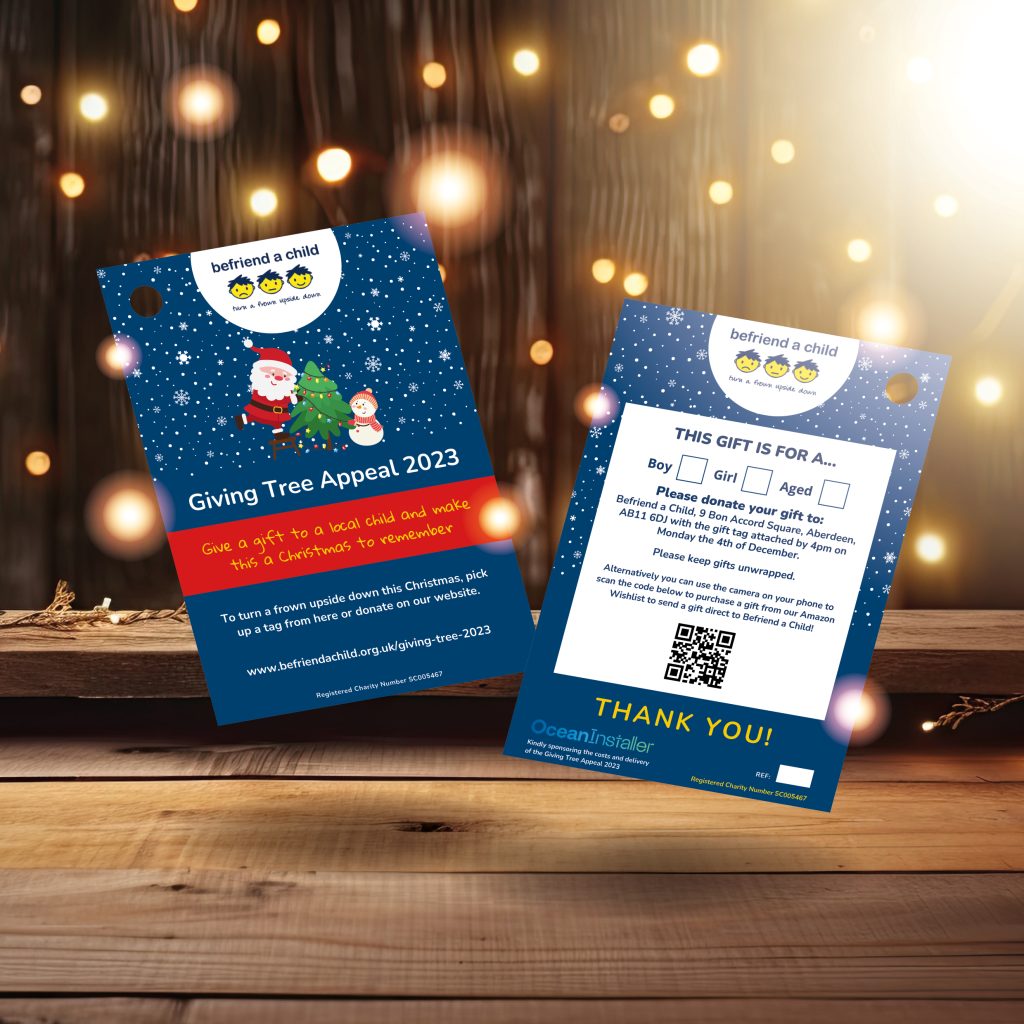 We also supported the Giving Tree appeals for both Befriend a Child and Instant Neighbour by producing these tags that can be found on Christmas Trees across Aberdeen and Aberdeenshire. The appeals are in place to ensure that families living in difficult circumstances can still have an unforgettable Christmas, and to help ensure no child goes without a gift!